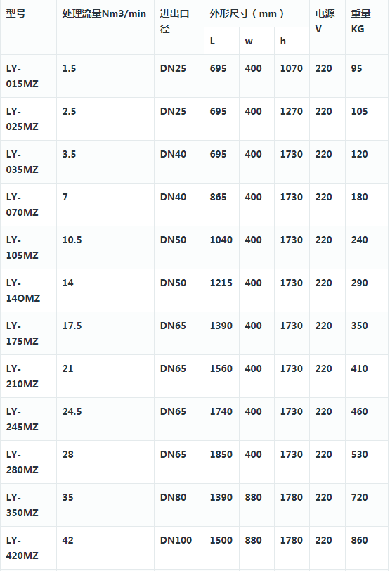 根据干燥器应满足的最小流量从表格中选出干燥器型号,确保所选型号的流量至少与此相等或更大。